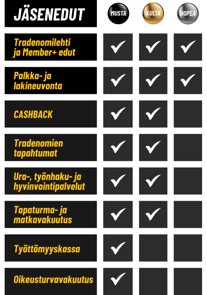 Musta-tason jäsenyys maksaa 87€ vuodessa ja siihen kuuluu kaikki Hopea- ja Kulta-tasojen edut, sekä lisäksi saat oikeus- ja työttömyys-turvan! Musta-tason jäsenyysehtona on voimassa oleva työsuhde, sillä työttömyyskassaan ei voi liittyä ilman sitä.